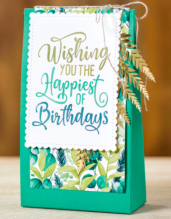 The artist at Stampin’Up!© who created this sample did a fabulous job! I am re-sharing it here because it’s a perfect way to show scale & size of the sentiment, fun multicolored inking, gold die cut elements, scalloped edge trim and a touch of twine – all these elements take a truly simple bag idea and makes it a stand out!